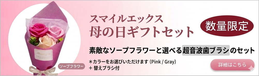 【おすすめ商品】 数量限定 スマイルエックス母の日セット🌹 14,825円(税込) 【選べる!替えブラシ2パック付】超音波歯ブラシ スマイルエックス AU-300D グレー 14,393円(税込) 希望小売価格: 15,150円 【選べる!替えブラシ2パック付】超音波歯ブラシ スマイルエックス AU-300D ピンク 14,393円(税込) 希望小売価格: 15,150円 【いろいろ試せる!替えブラシ3パック付】超音波歯ブラシ スマイルエックス AU-300D グレー (ST・MF・MH) 14,773円(税込) 希望小売価格: 15,550円 【いろいろ試せる!替えブラシ3パック付】超音波歯ブラシ スマイルエックス AU-300D ピンク (ST・MF・MH) 14,773円(税込) 希望小売価格: 15,550円 【選べる!替えブラシ3パック付】超音波歯ブラシ スマイルエックス AU-300D グレー 14,868円(税込) 希望小売価格: 15,650円 【選べる!替えブラシ3パック付】超音波歯ブラシ スマイルエックス AU-300D ピンク 14,868円(税込) 希望小売価格: 15,650円 【ネコポス限定】替えブラシ3パックセット スマイルエックスAU-300D用 3,582円(税込) 希望小売価格: 3,770円 もっと見る