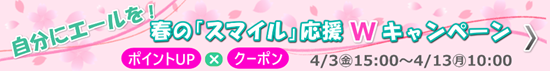 「自分にエールを!春の『スマイル』応援Wキャンペーン」を開催します。毎日を頑張る自分へのご褒美に、お得なお買い物でもっと笑顔になれるキャンペーンをご用意しました。この機会をぜひお見逃しなく!