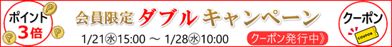会員様限定の「ダブルキャンペーン」を開催いたします。全品対象のポイント3倍と、お得なクーポン2種類をご用意しております。ぜひお買い物にお役立てください。