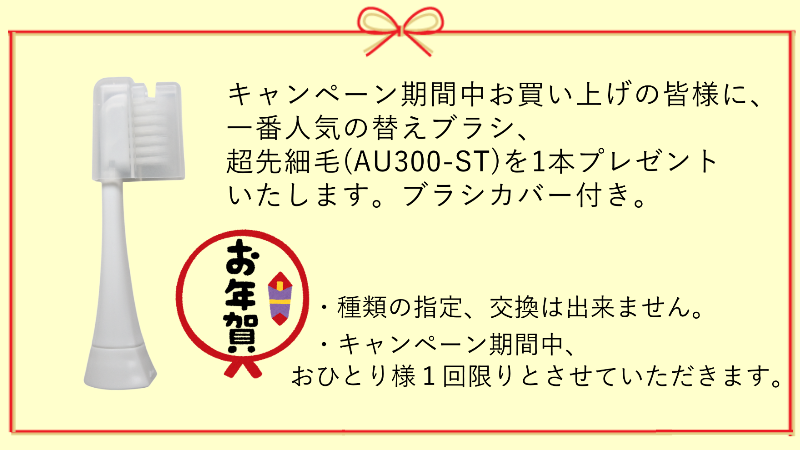 新年最初のキャンペーン「2026新春お年賀キャンペーン」を開催いたします。期間中にご購入いただいた皆さまに “替えブラシ”を「お年賀」としてプレゼント! また、会員様限定でポイントが2倍にアップ!お得なクーポン3種類も発行しております。会員登録後すぐにキャンペーンにご参加いただけますので会員登録をお勧めしております。
